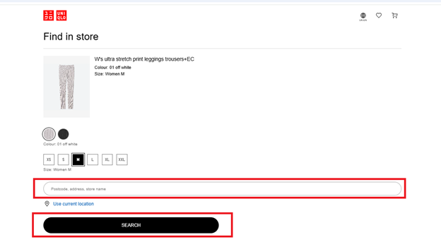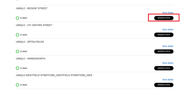 On the page of the desired product, select the colour and size, then click [Check store inventory].